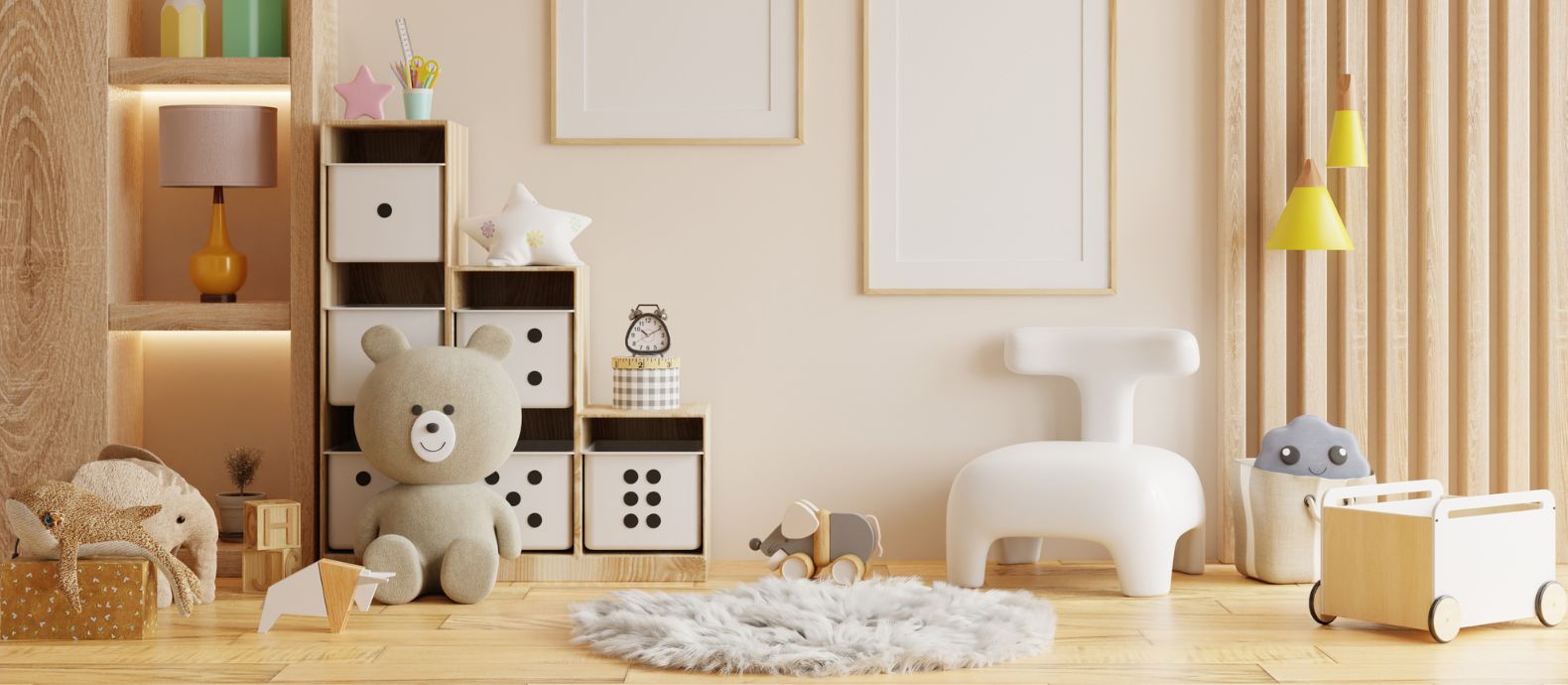 Plants and natural decorations — Add potted plants, wicker baskets, macramé hangings, and fabric garlands. Opt for child-friendly, hardy plants like snake plant or zamioculcas.