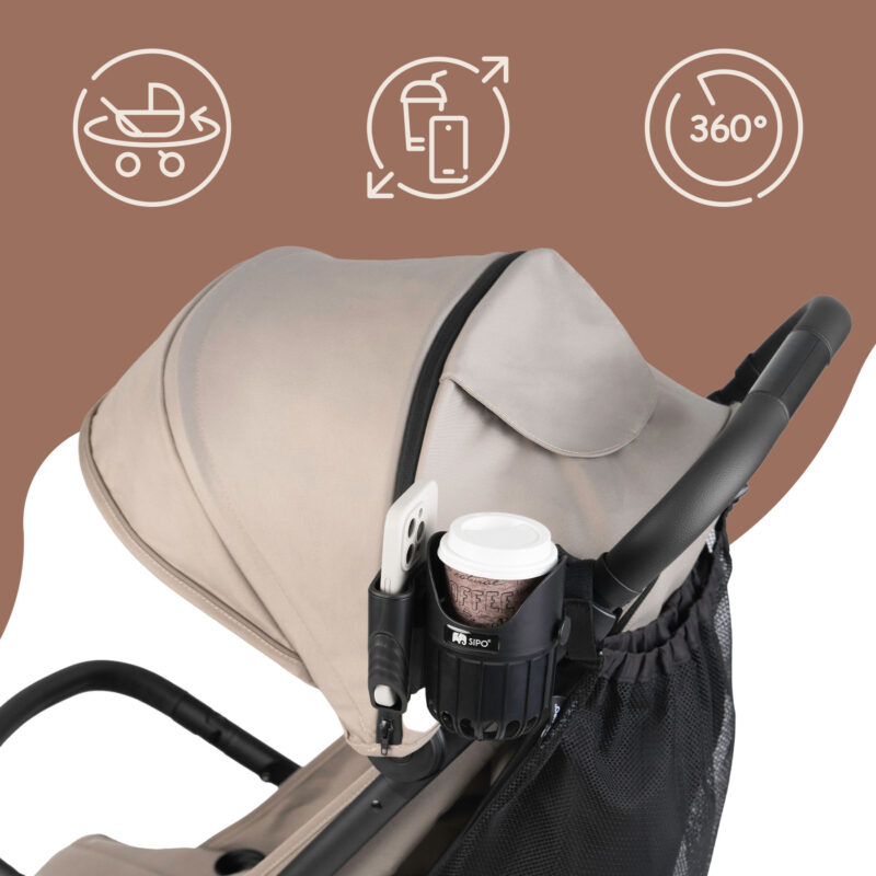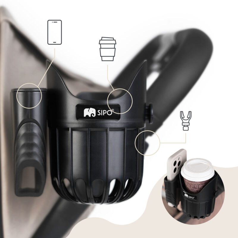 Uniwersalny uchwyt SIPO pasuje do większości modeli wózków i sprawdzi się zarówno w miejskiej dżungli, jak i podczas wycieczek za miasto. To niewielki dodatek do wózka, który naprawdę robi różnicę.